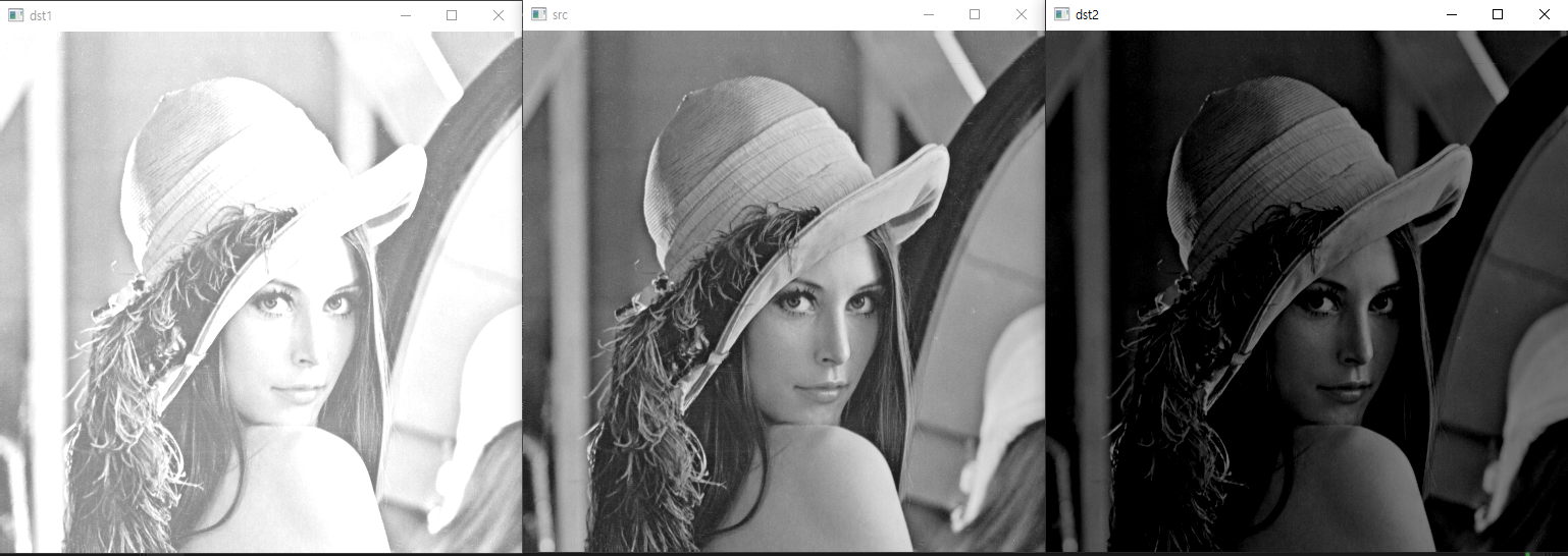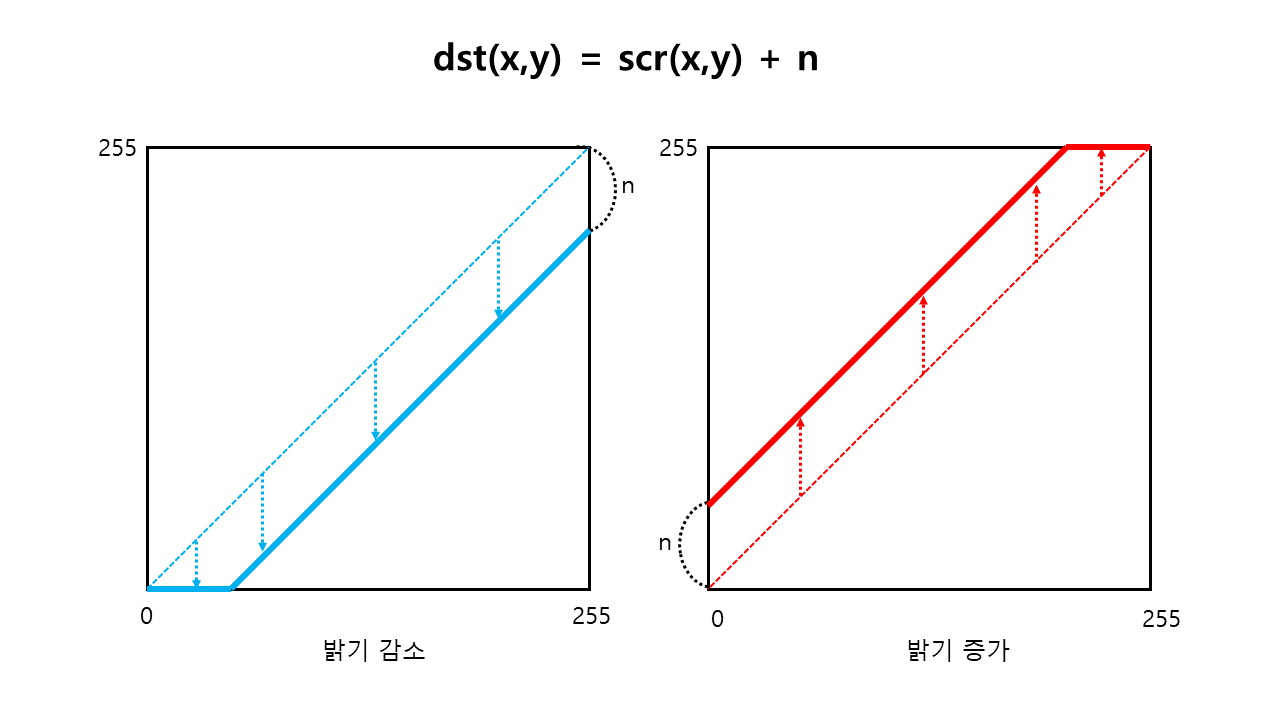 scr은 입력 영상, dst는 출력 영상, n은 조절할 밝기 값을 나타낸다. n이 양수이면 출력 영상 dst의 전체적인 밝기가 증가하고 반대로 n이 음수이면 밝기가 감소한다